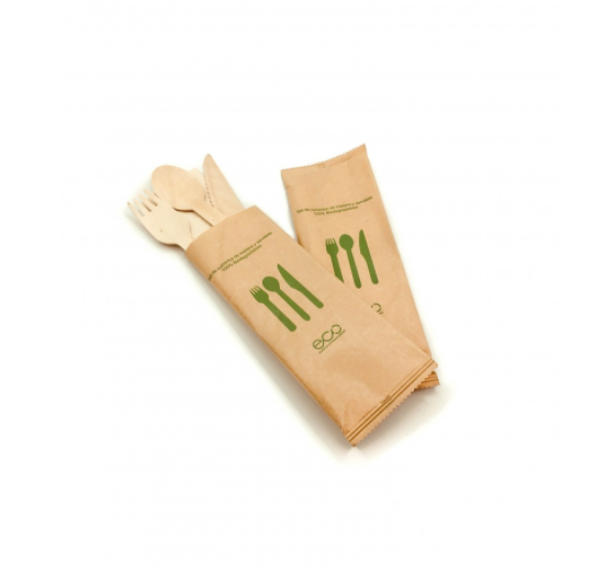Set 4 Cubiertos Madera, cuchillo, cuchara, tenedor y servilleta, ideal para entregar en delivery, restaurantes o eventos.